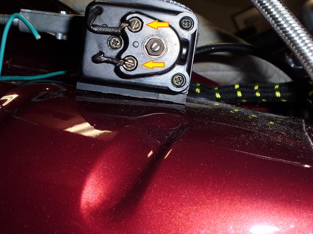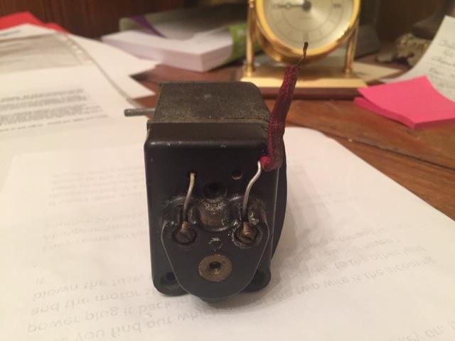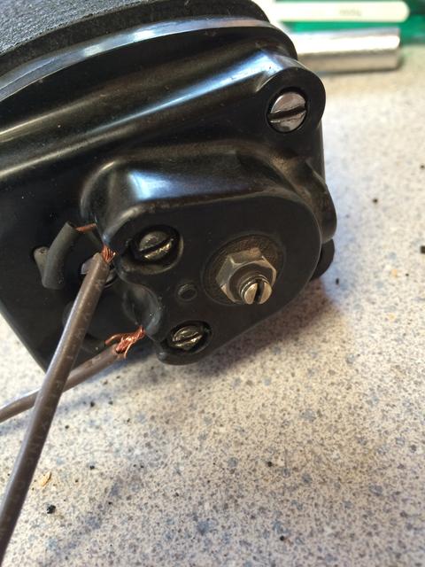 - in the pictures you will see two bare wires coming through the cover and attaching to the brass set screws. I really don't see the purpose of these wires. Inside each is soldered to a separate screw head. One of them fell off mine when I removed the cover. When they come from underneath the cover the two set screws hold them in place, but nothing externally connects to the wires. On the underside of the cover nothing is connected to the set screw posts. If externally a positive 'hot' wire connected to one and a negative ground to the other, then I could understand. In LaVerne's picture a wire comes out of the top left hole. I have a red wire coming out at the same position so I'm assuming that is the hot wire.