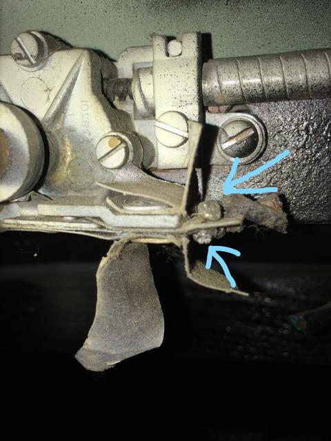 In these images you can see where the wires were cut off of this switch on both of the contact points. The second image shows both the blade which is on one of the points that pushes them apart when the knob is pushed in. The last photo better shows the knob shaft and the bevel relationship to the blade on the points. If the shaft knob is turned and released towards the cockpit, you can see how the blade will follow down the bevel portion and allow the points to come together to make the electric connection....in theory