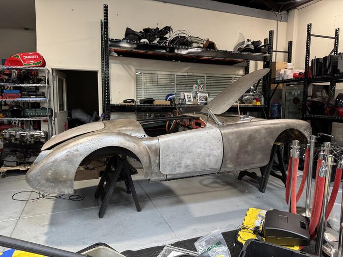 1956 MGA with a Jaguar 2.4L, Straight port head, MkX triple SU intake with HS6 carburetors, Moss box, very narrowed IRS from a Series 1 XJ6.