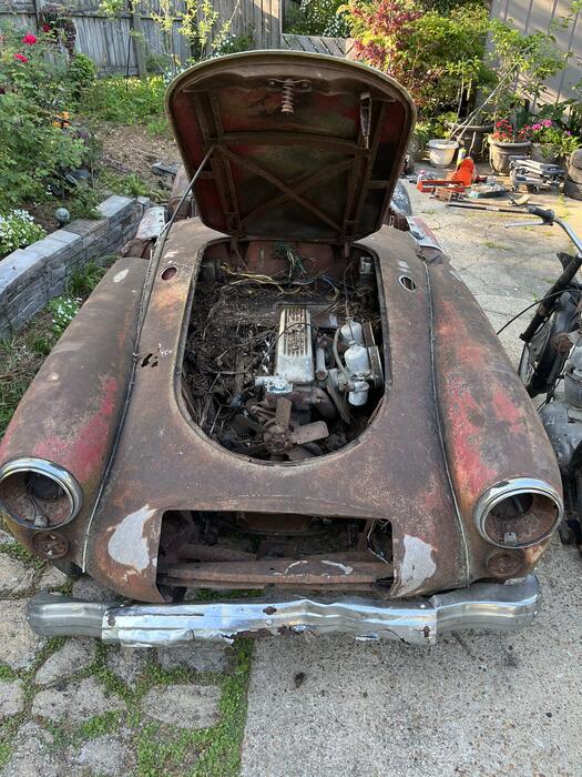 Saved from the crusher, my 1960 MGA 1600 is not much to look at at the moment. It has a huge amount of rust through the frame, body and body panels. Was living in the deep woods of Alabama. It is a “complete” car but will be a long term restoration. More photos to come.